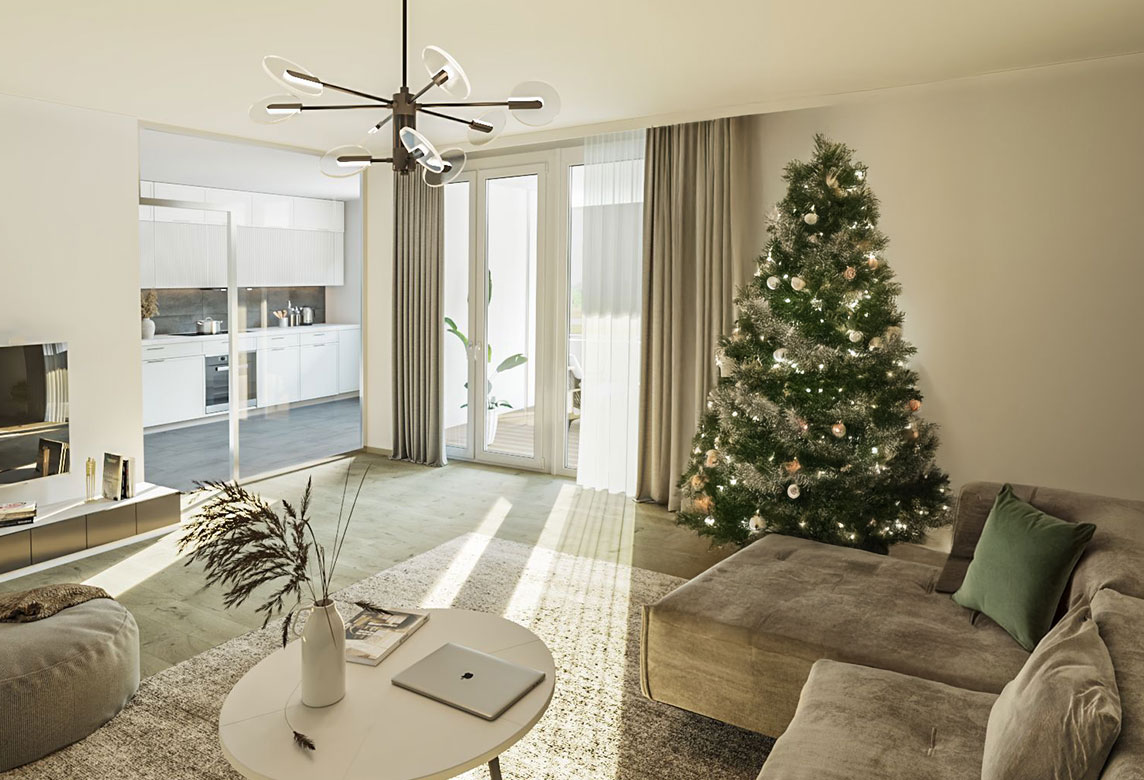 Der offene, weitläufige Wohn- und Kochbereich schafft Raum für gemütliche Stunden – ob Adventsdekoration, gemeinsames Kochen oder entspannte Abende bei Kerzenschein. Zwei Balkone mit Blick ins Grün ergänzen das Wohlfühlambiente. Fußbodenheizung, elegante Ausstattung und eine moderne Gebäudeinfrastruktur machen das Wintergefühl perfekt.
